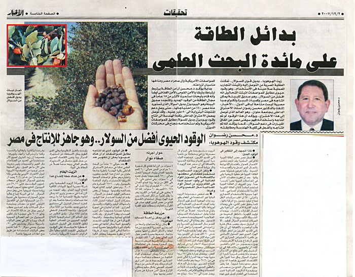 قام قسم الميكانيكا بكلية الهندسه جامعة حلوان بنشر أول رساله ماجيستير كان عنوانها إستخدام زيت الهوهوبا بعد تعديل بعض مكوناته كوقود حيوى لمحركات الديزل دون الحاجه الى أي تغيير في المحرك ، كما قام باحث أخر بالحصول علي درجة الماجيستير عن تشغيل محركات الديزل بالوقود الناتج من زيت الهوهوبا وأثبت أن كفاءة الوقود أفضل من السولار والتلوث الناتج عن إستخدامه أقل كثيراً من السولار، مما يفتح آفاق جديدة لاستخدامات زيت الهوهوبا كوقود ، كما أن هناك أكثر من أربعة باحثين يعملون في نفس المجال بالكلية لرفع كفاءة الاستخدام ، وقام الأستاذ الدكتور / محسن رضوان الأستاذ بهندسة حلوان بنشر بحثان في أكبر المجلات العلمية عن الطاقة في الولايات المتحدة عن تحويل زيت الهوهوبا إلي وقود والثاني عن إستخدامه في محرك الديزل بكفاءة دون تغيير أي مكون في المحرك ، حيث توصل حالياً الدكتور / محسن رضوان الى انتاج وقود حيوى ((Biodiesel من زيت الجوجوبا ومطابق للمواصفات الاوروبيه للوقود الحيوى بديل للسولار وهى(EN14214)، كما توصل إلي إنتاج بنزين من زيت الهوهوبا ذو طاقة حرارية عالية جداً يستخدم في محركات البنزين ، حيث توصل الدكتور / محسن سالم رضوان الى انتاج بنزين (اوكتين 95) كذلك توصل الى انتاج إضــافات للبنزين (اوكتين 80) لرفع كفاءته الى بنزين (اوكتين95)