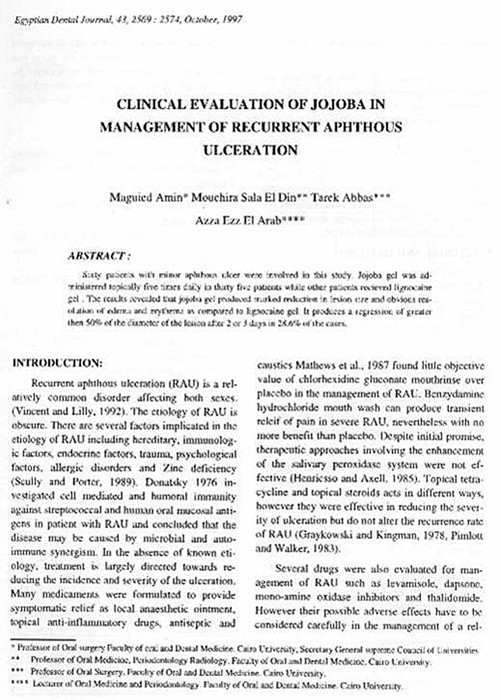 اول بحث طبى عن علاج زيت الهوهوبا لقرح الفم واللثه حيث تم تقديمه لوزارة الصحة المصرية (الهيئة القومية للرقابة و البحوث الدوائية) كخامة دوائية جديدة حيث ثبت أنة مضاد للالتهابات و قاتل لانواع من البكتريا و يسرع في إلتئام الجروح بالاضافة إلي أنه ملطف ، وقد تم نشر أول بحث طبي مصري في مجال طب الاسنان عام 1997 حيث ثبت أن للزيت تأثيرات ممتازة قي علاج قرح و إلتهابات الفم و اللثة و اللسان ، كما أنه يعالج الالتهابات الناتجة من التركيبات الصناعية للاسنان ، كما أنه يمكن إستخدامه في الحشو المؤقت للاسنان بكفاءة عالية